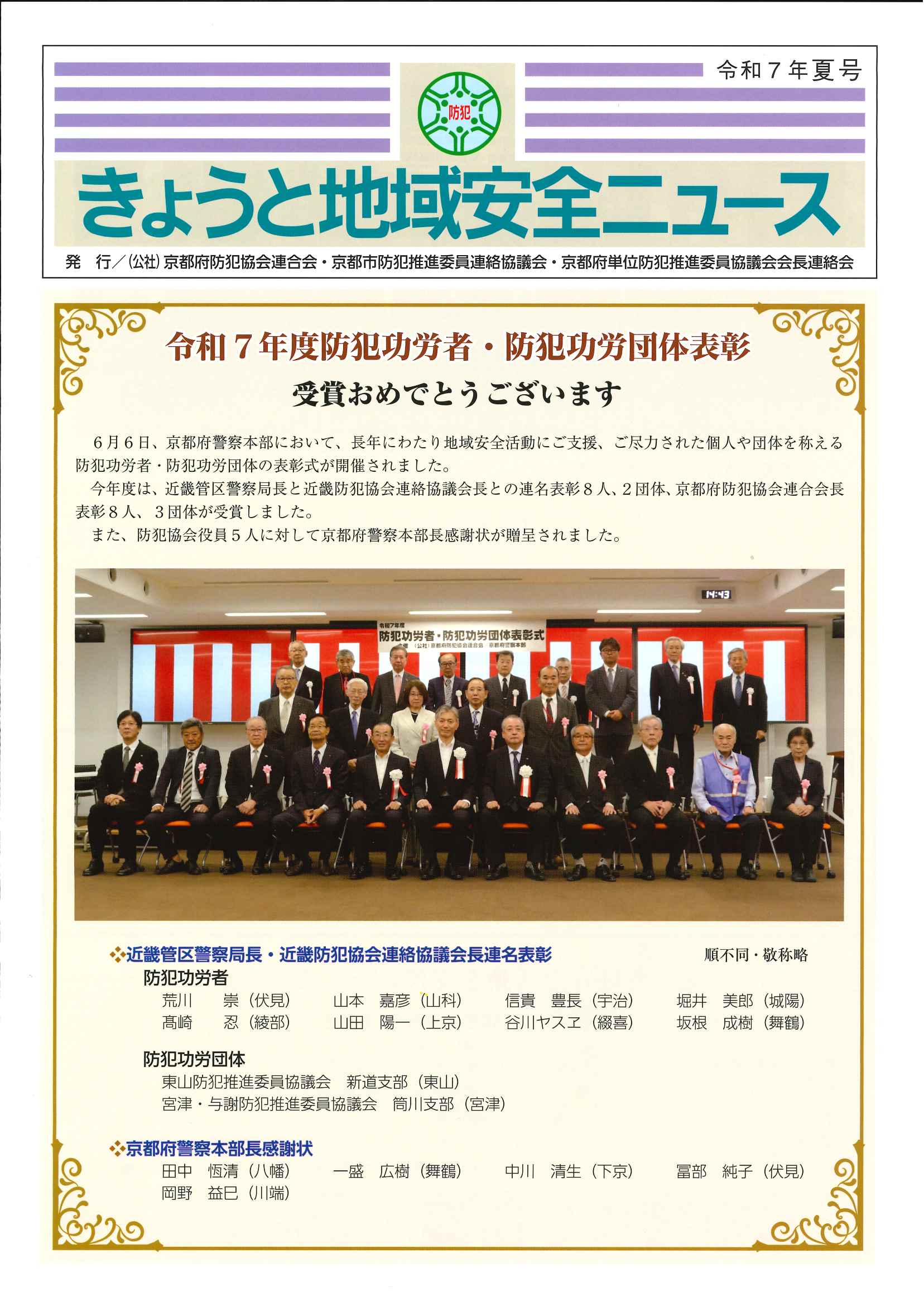 当連合会をはじめ、地域安全防犯ボランティア団体の活躍状況や防犯功労者(団体)の受賞紹介のほか、犯罪の発生状況、犯罪に遭わないための注意点等、地域安全広報啓発媒体など幅広く掲載しています。